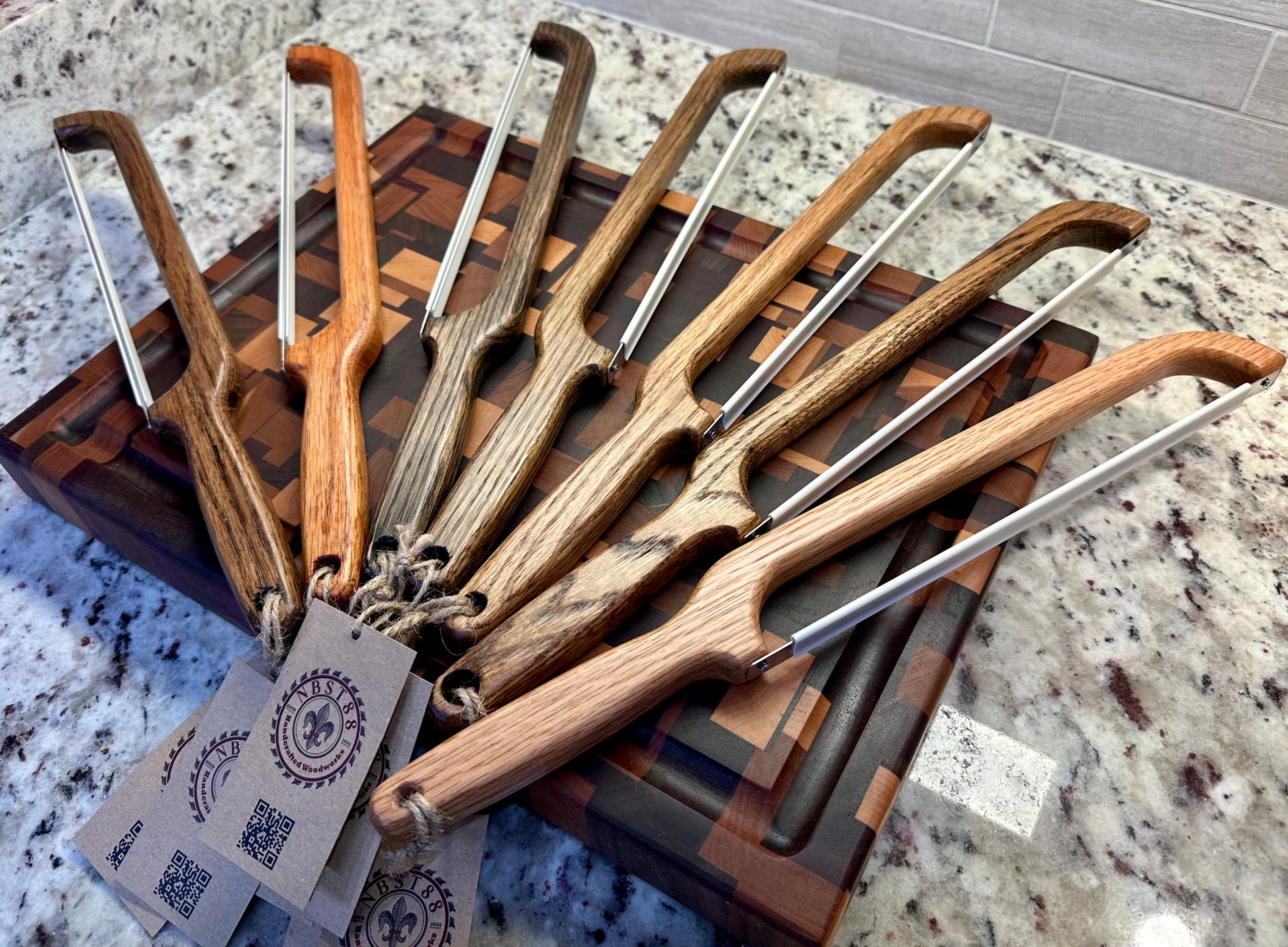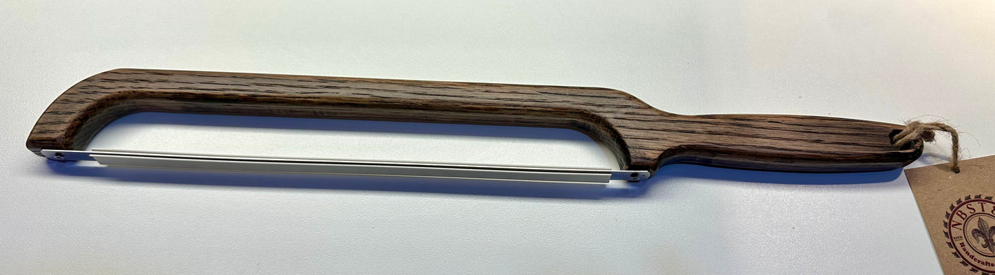 Handmade Appalachian bread bow knife with cover also known as a fiddle knife. Each knife begins with furniture grade dimensioned red oak hardwood that is cut out, shaped, hand-sanded and given a hand-rubbed finish in 7 varieties to complete the knife. The knives effortlessly cut through all types of bread including sourdough, cheeses, fruits, vegetables, and cooked/dried meats.