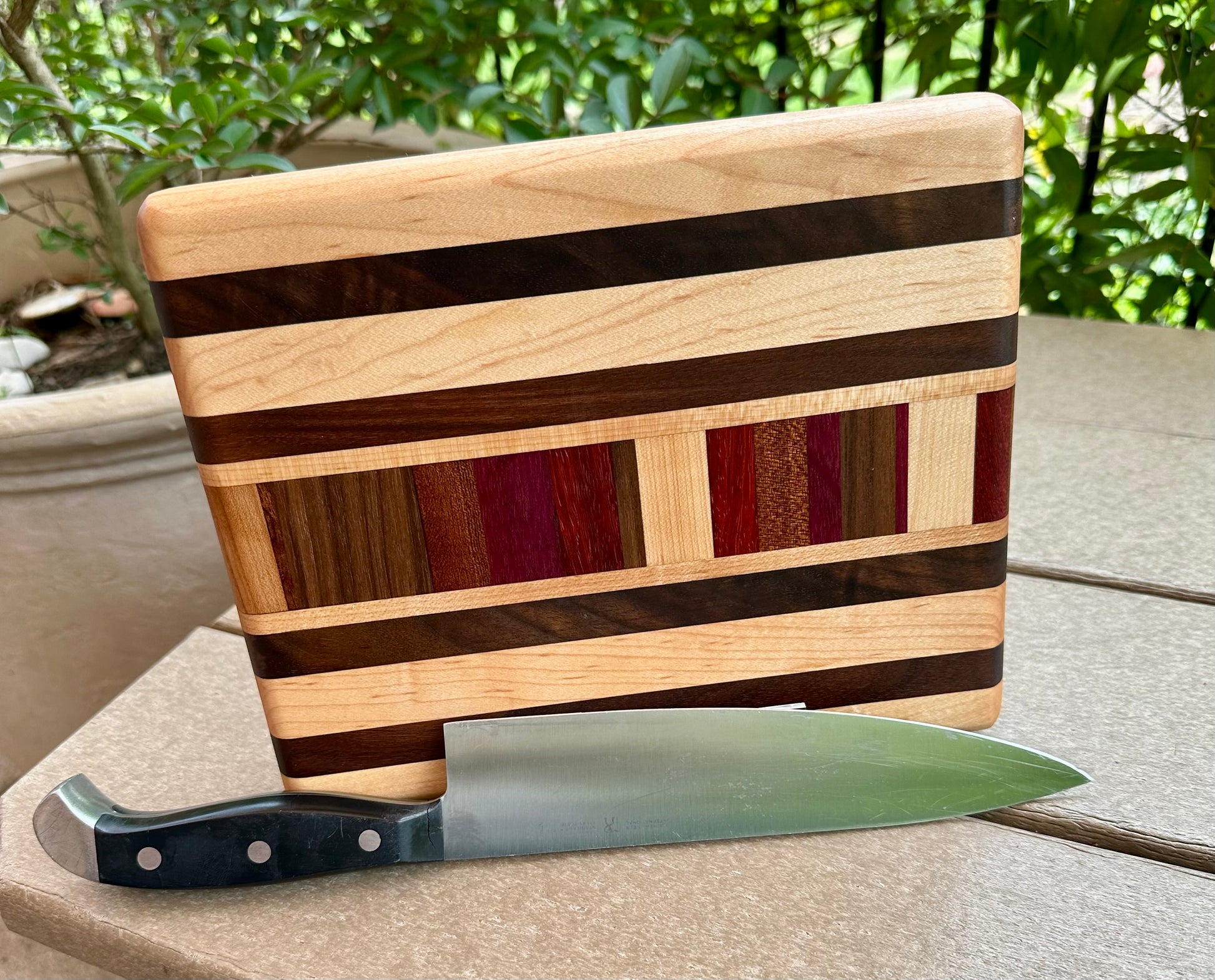 Chaos accent: A bold, handcrafted inlay of six exotic hardwoods — Padauk, Sapele, Walnut, Maple, Purpleheart, and Cherry — creates a one-of-a-kind "chaos" pattern that turns every board into a unique centerpiece.