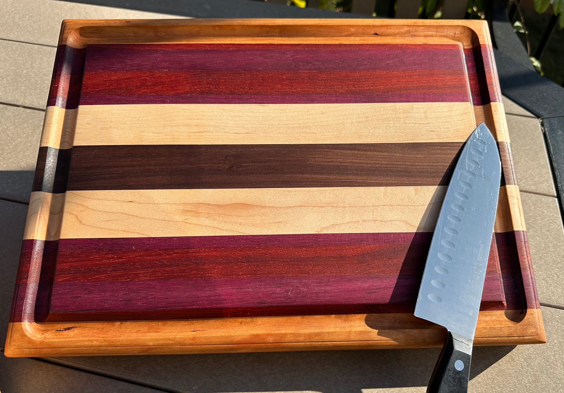 This isn't just a cutting board; it's a work of art. Handcrafted with meticulous care, this 8lb beauty showcases a stunning blend of 5 premium hardwoods: rich cherry, vibrant padauk, exotic purple heart, classic maple, and deep walnut. This board is a unique masterpiece, with the grain patterns dancing across the surface like nature's own abstract painting. The included care kit (over $25 value) ensures your board remains a kitchen heirloom for generations.
