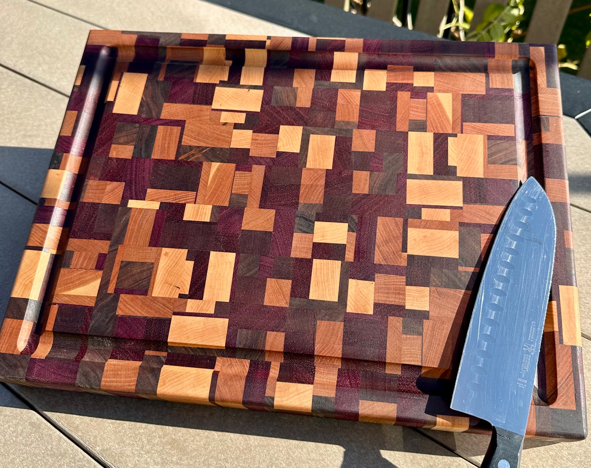 Discover this stunning cutting board handmade and highlighting 6 different species of woods, 3 from North America (Hard Maple, Cherry & Dark Walnut) and 3 from Western Africa (Padauk, Purple Heart and Sapele). This board is truly a one of a kind, handmade, masterpiece, weighing in over 8lbs. Bring a little chaos in your kitchen and impress your guests every time you display it!