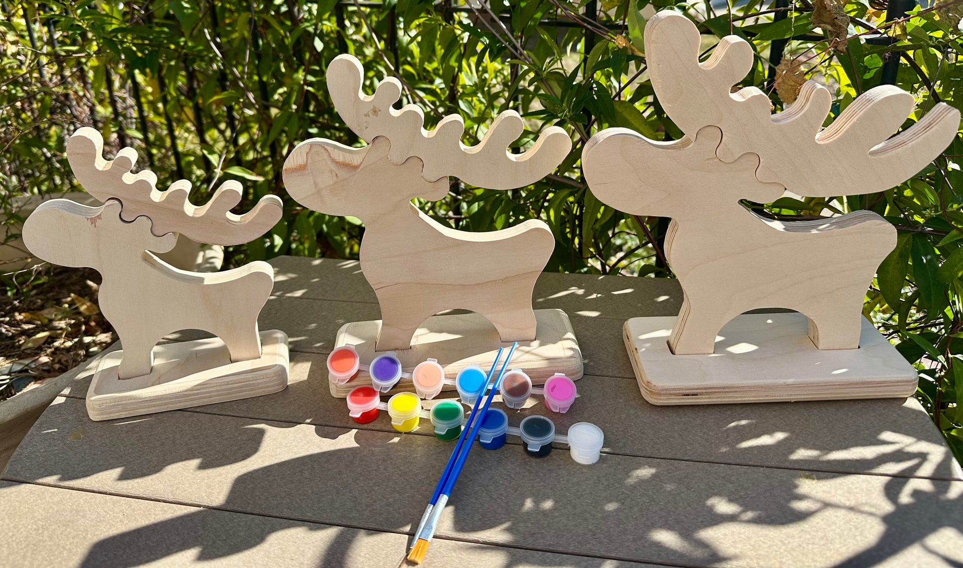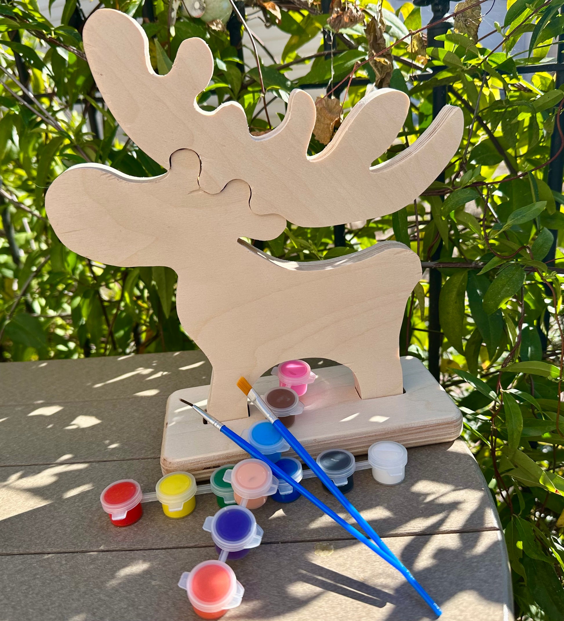 Our larger size moose is waiting to be transformed into your personalized holiday masterpiece. The included painting kit comes with vibrant, non-toxic acrylic paints and a set of two brushes. Own all 3 sizes to show your talent!