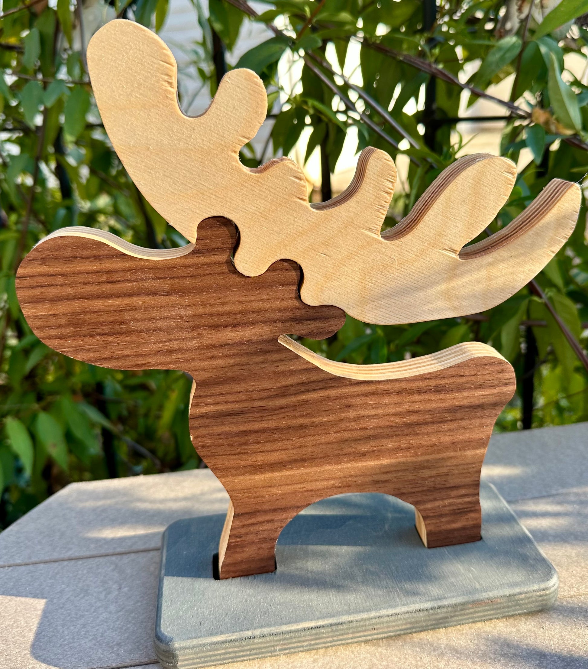 Transform your space with this hand-carved medium moose, a stunning piece that brings the spirit of the wild to your tabletop or mantel. Perched on its own pedestal, this moose is crafted from rich, dark walnut, radiating rustic charm and cozy holiday vibes.